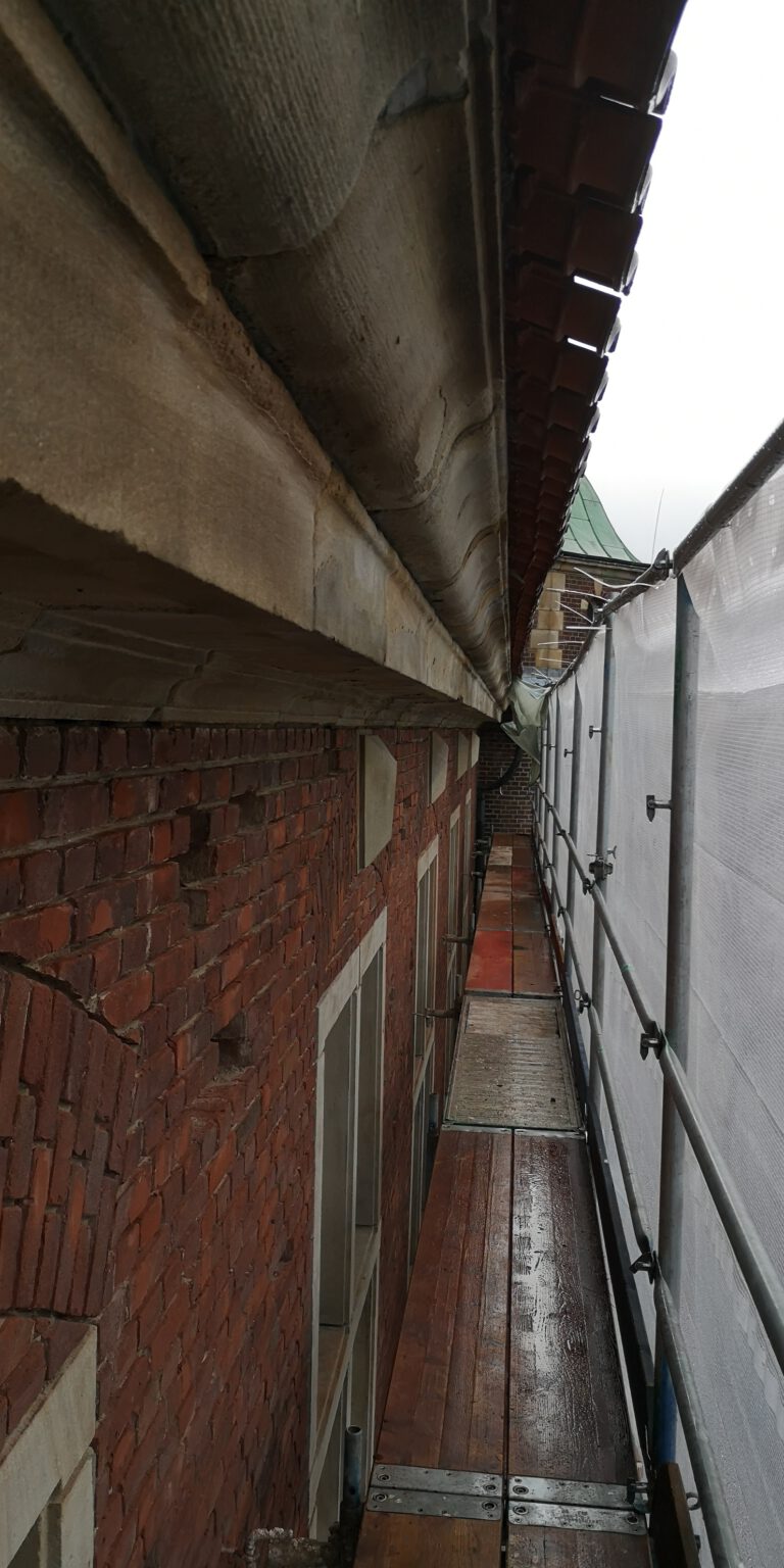 Da alle Fugen marode waren, wurden im Zuge der Maßnahme der alte Fugenmörtel entfernt und alle Steinflächen gereinigt. Fehlstellen am Ziegel und am Naturstein reprofiliert bzw. durch neue Steine ersetzt und anschließend alles neu verfugt.
